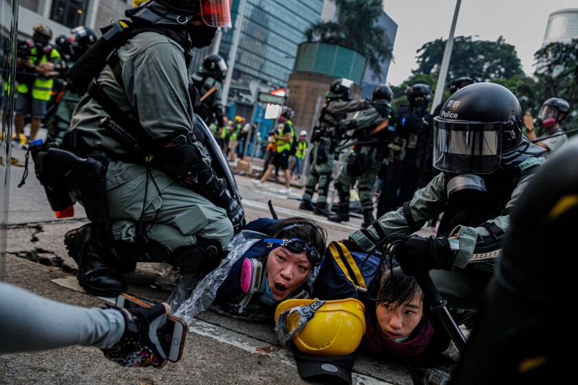 Police officers detain protesters in Hong Kong on Sept. 29, 2019.
